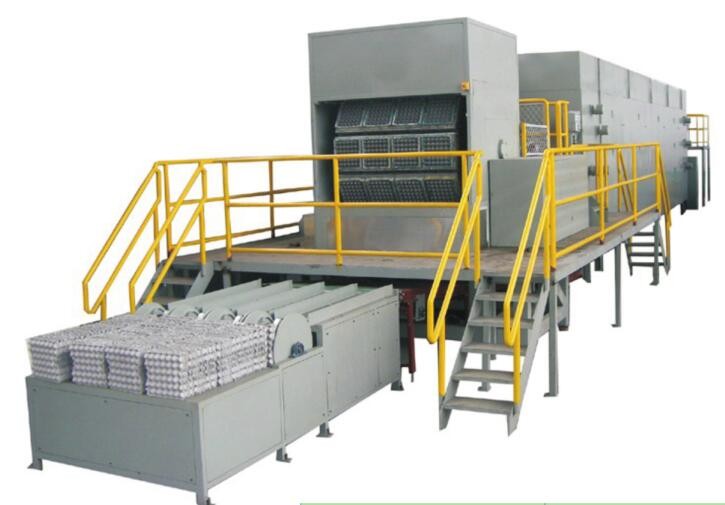 成型模板數(shù):12個 材質(zhì):不銹鋼 尺寸:1600*400mm 裝模數(shù)量:每個成型模板可裝4件蛋托?! ∵\行速度:14-17板/分鐘 電機功率:5.5KW 控制方式: 日本三菱PLC+觸摸屏控制 產(chǎn)品轉(zhuǎn)移方式:自動送至烘干線